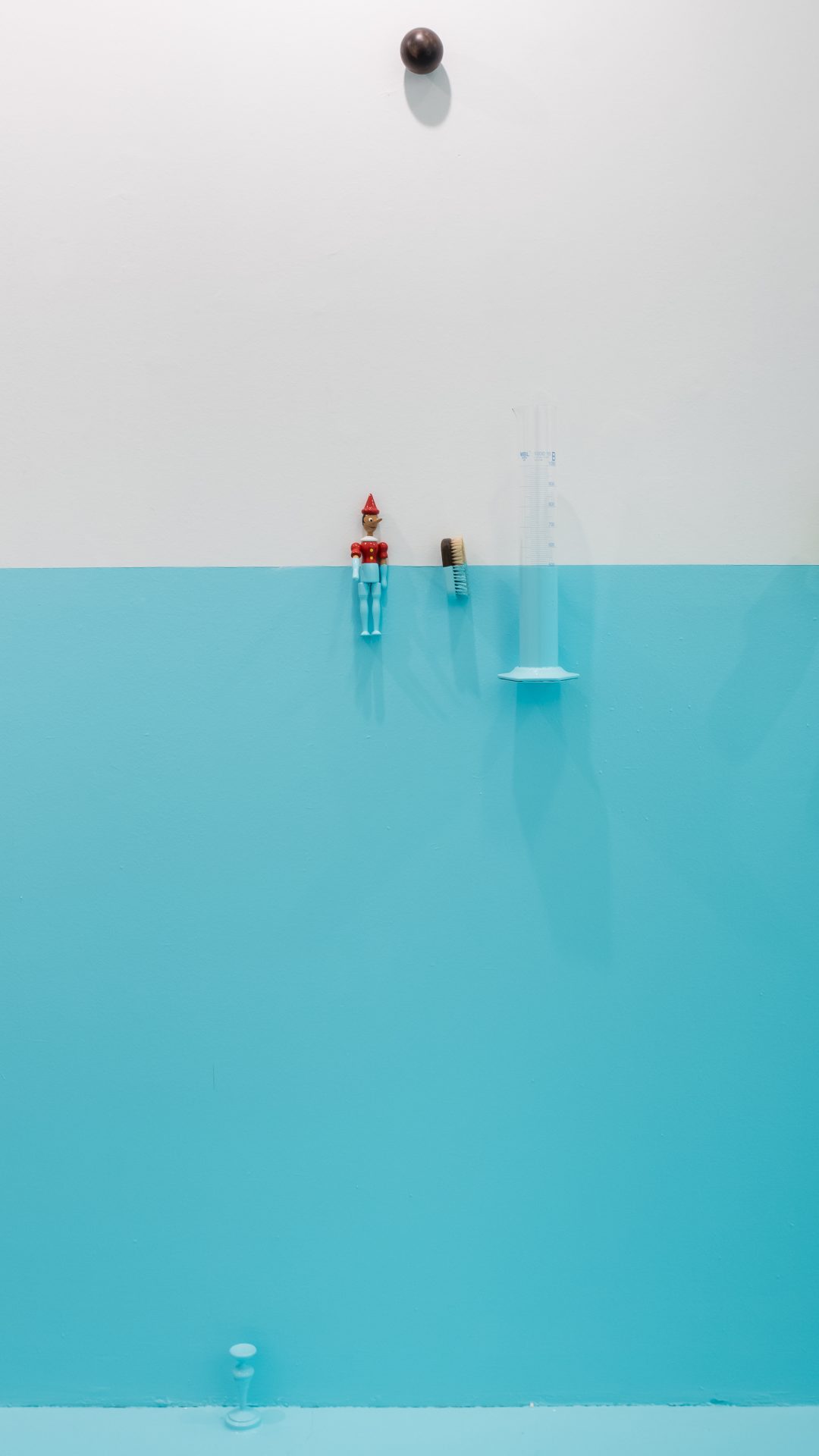 Davide ha portato a Dynamo Camp la sua ricerca sul tempo e sulle contrapposizioni: cosa è visibile e cosa resta nascosto? Cosa voglio mostrare e cosa voglio preservare? Come uno sciamano alla guida della sua piccola tribù di artisti, Davide ha condotto i bambini all’interno della sua ricerca. A partire dalla domanda “cosa è caldo e cosa è freddo per te?” i bambini hanno sperimentato la pittura antivegetativa sui tesori che lo sciamano ha raccolto in un tempo lontano, lavorando su antiche tele o immergendo gli oggetti in quella che è stata chiamata la “Fonte del Sacro Celestino”. L’antivegetativa con il suo azzurro compatto nasconde qualsiasi traccia del tempo, o forse tenta di preservare la materia da esso. Ciò che è rimasto sotto la superficie della pittura sono i sogni, i desideri o i “lati nascosti” dei bambini, scritti sui muri della nostra Gallery e poi tornati segreti sotto un’immersione di celeste.