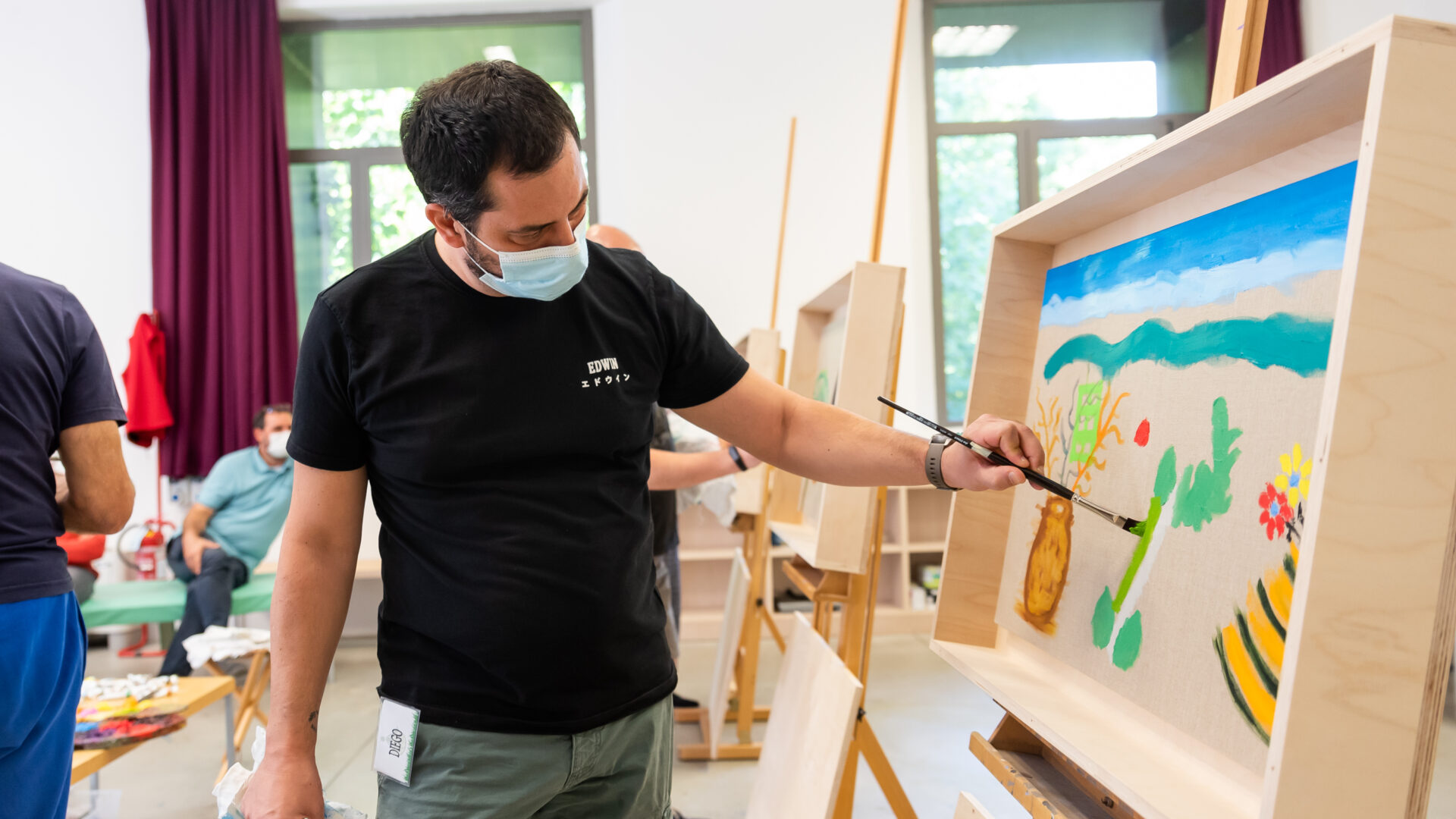Matteo Fato ha portato al Camp la sua grande tavolozza, colma di luminosi colori, ed ha fatto entrare i genitori della sessione famiglie dentro il suo mondo di pittura ad olio. Dopo una passeggiata nel parco della villa, durante la quale ogni partecipante ha potuto scattare qualche foto con delle macchine fotografiche istantanee, vi è stato un dialogo sui concetti di arte, colore, paesaggio, immagine. In seguito ogni genitore ha potuto lasciare una traccia di sé sulle tre tele, precedentemente preparate dall’artista secondo la maniera rinascimentale e già montate nelle tre casse. Ogni dipinto racchiude quindi l’impressione, l’emozione, l’immagine che ogni partecipante ha dapprima catturato nella foto e poi riportato, in maniera più o meno gestuale, descrittiva o astratta sulle tele. Ad accompagnare le tele altre tre piccole tele realizzate con gli stracci sui quali sono stati puliti i pennelli ad ogni cambio colore, a testimonianza di un processo iniziato dal primo gruppo e finito cinque giorni dopo dall’ultimo gruppo, in un lavoro in divenire e mai uguale a se stesso.