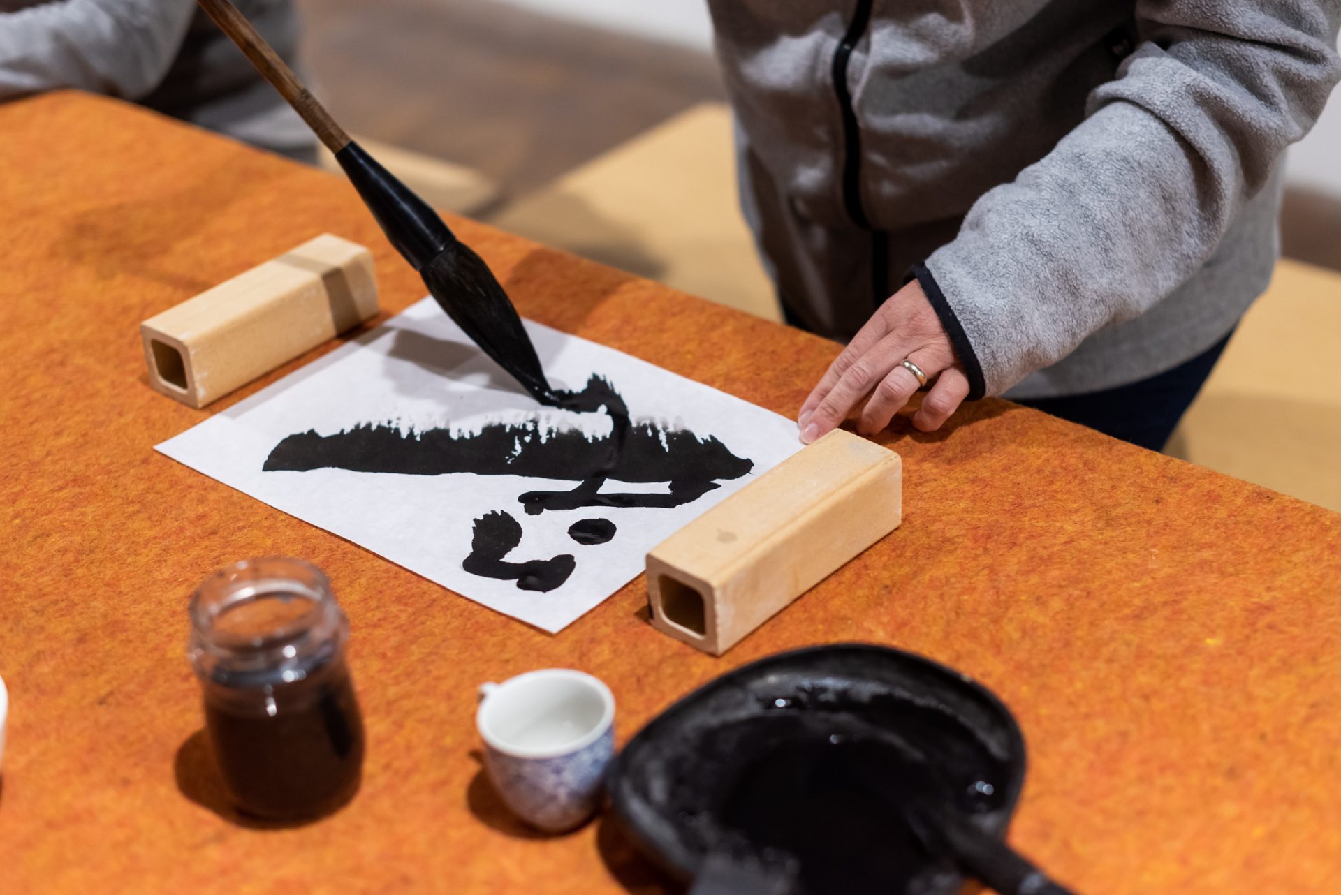 Seguendo la filosofia cinese basata sull’approccio all’osservazione e all’interiorizzazione delle cose, ogni partecipante ha selezionato un ideogramma dal testo e attraverso l’inchiostro, la carta di riso e le tecniche calligrafiche tradizionali, ciascuno di loro ha potuto ricreare tramite una pittura gestuale la propria versione artistica della parola scelta.