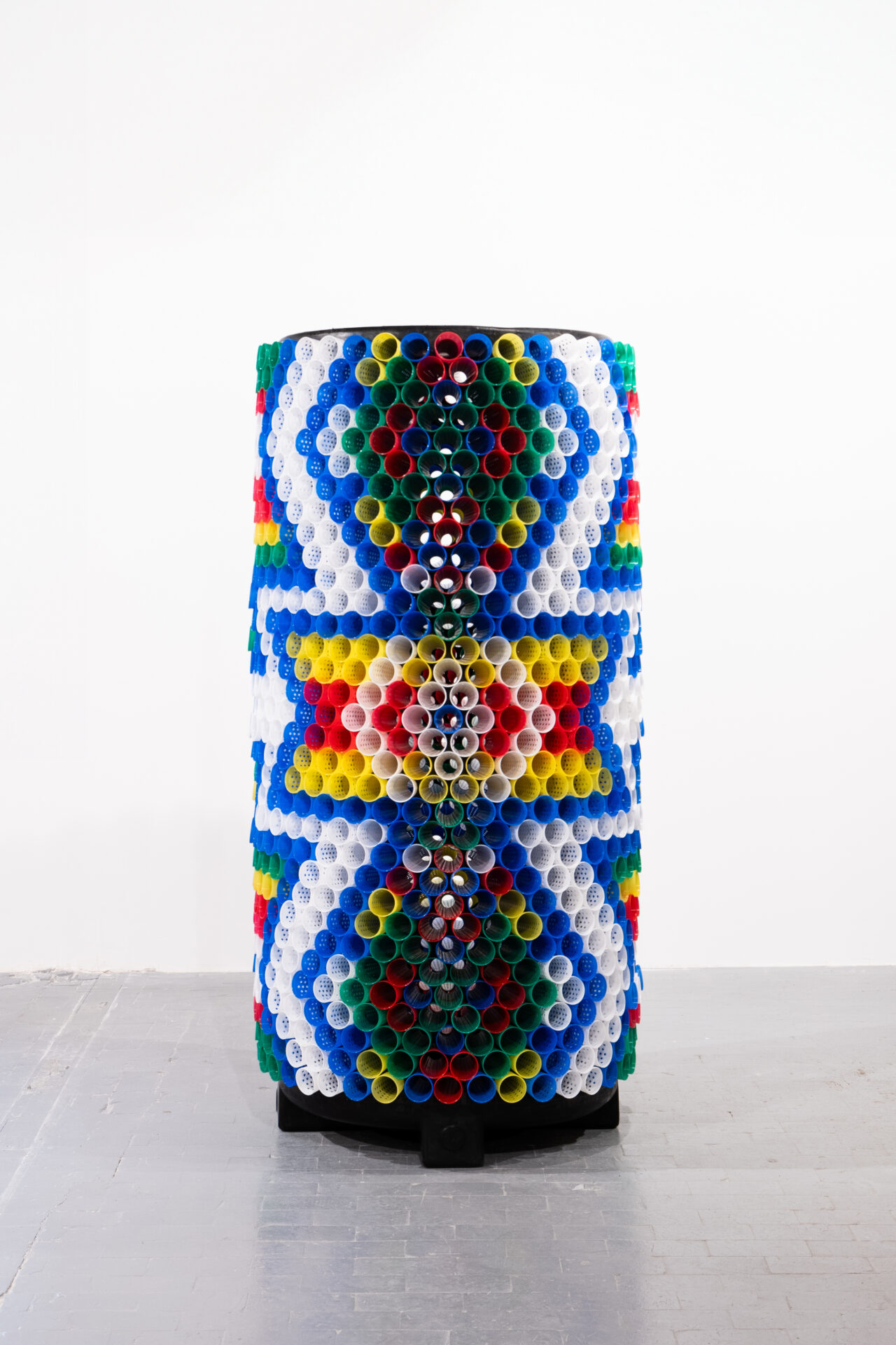 Le sei strutture cilindriche che costituiscono l’installazione Noi siamo tribù intrecciano la storia e l’identità di IPER-collettivo con quella di Dynamo Camp. Il corpo a colonna decorato in pattern,  teso a evocare la figura del totem, riflette sull’organizzazione sociale interna al Camp, dove ogni settimana si formano clan e tribù temporanee che, attraverso tradizioni e rituali condivisi, si riconoscono come parte di un gruppo. Nella cultura Ojibbwa infatti, “ototeman” (totem) significa “esso è del mio stesso clan”, esprimendo il senso di appartenenza a una comunità identificata da un particolare disegno cromatico. Il pattern decorativo, in una modalità che prende ispirazione dalla pixel art, è riprodotto su ciascun totem attraverso l’utilizzo di rocche tessili colorate. Il sistema tessile, profondamente legato al territorio pratese da cui proviene IPER-collettivo, simboleggia sia la memoria sia il presente. La rocca tessile, infatti, evoca ricordi d’infanzia e rappresenta la comunità locale, ma è anche simbolo dell’inquinamento generato dal sistema produttivo tessile, che spesso smaltisce il prodotto dopo un solo utilizzo. Per la creazione di quest’opera sono stati riutilizzati rocchetti recuperati da magazzini, ormai inutilizzabili nella produzione.