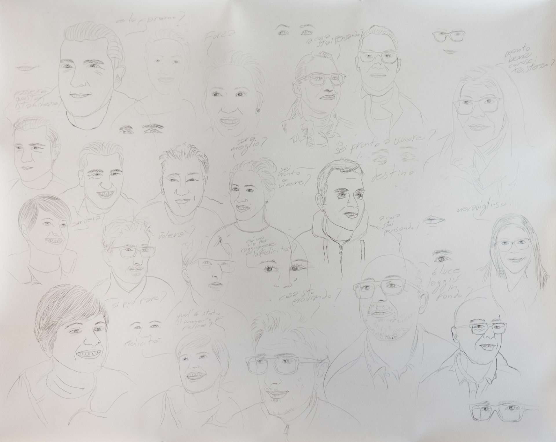Andrea ha portato uno dei suoi mezzi d’espressione prediletti: il ritratto a matita, esplorandolo insieme ai genitori di una sessione famiglie. Ognuno ha lavorato sulla propria foto, o sulla foto di un altro genitore, fino a creare grandi opere costellate di volti. Tutti gli adulti si sono cimentati con due temi all’apparenza difficili: il disegno ed il ritratto. Una moltitudine di espressioni e di sguardi riempie i grandi fogli a cui i genitori hanno affidato frasi o domande da loro formulate: “Non ci posso credere…da soli e senza bambini!”, “Vogliamo stare per sempre qui?”, “È luce laggiù in fondo?”, “Si può mentire con gli occhi?”. Frasi che attraggono lo spettatore all’interno dell’immagine aprendo degli spiragli di riflessione in cui ognuno si può immergere.
